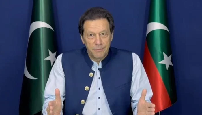 Pakistan Tehreek-e-Insaf (PTI) founder Imran Khan addressing people during a broadcast in Lahore, on May 26, 2023, in this still taken from a video. — YouTube/PTI