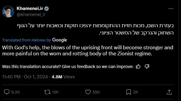 آیت اللہ خامنہ ای نے سوشل میڈیا پر یہ پوسٹ عبرانی زبان میں کی ہے اور یہ پوسٹ ایران کی جانب سے اسرائیل پر بیلسٹک میزائل برسانے کے چند ہی لمحے بعد کی گئی۔